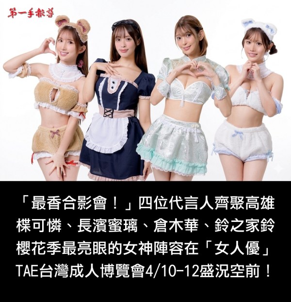 「最香合影會!」四位代言人:楪可憐、長濱蜜璃、倉木華、鈴之家鈴 櫻花季最亮眼的日本女神陣容 齊聚港都高雄! TAE台灣成人博覽會4/10-12 亞洲潮流嘉年華 邀老司機上車