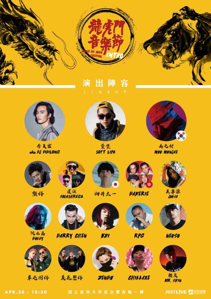 《龍虎門音樂節 LONG HU MEN FESTIVAL》以推廣華語嘻哈文化、拓展華語嘻哈視野為目標,集結亞洲嘻哈好手齊聚一堂,跨越國界語言、音樂廠牌合作,激盪出非同凡響的音樂火花。首次舉辦就決心朝「音樂節」規模進行,主辦單位感謝認同理念、熱情參與入陣的海內外各嘻哈廠牌表演藝人,促成了這次堅強的演出陣容。完整演出名單為(照公佈順序排列):Chillaxe、NEOSO、RPG、ZENBØ、SmashRegz 違法、Bolly阮禾茜、Julia吳卓源、Barry Chen、ØZI、熊仔、MR. SKIN/賴皮、禹元材(韓國)、向井太一(日本)、BAKERIE(香港)、草屯囝仔、臭屁嬰仔、李英宏 aka DJ Didilong、蛋堡 Soft Lipa。