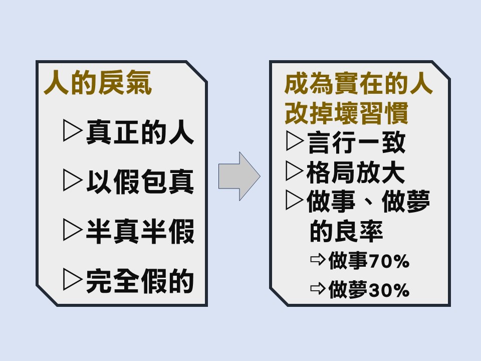 第三點就是做事、做夢的良率,當然人也要有夢想,人因為夢想而偉大,要達到一種行為的平衡,最佳組合則是人的「夢想佔三成,做事佔七成」。戾氣是自己的問題,所有的根源都在於自己,對自己或他人,絶對不能產生不好的心思,自己一定要練習不受影響,立即覺察自己的問題,自然而然就能夠化解戾氣了。