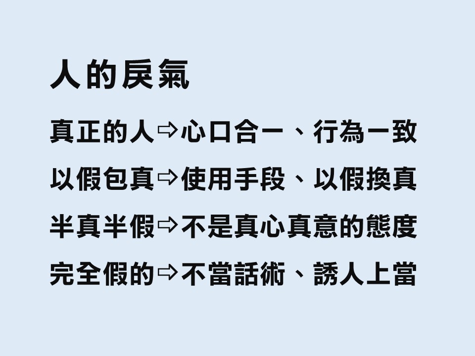 第二種「以假包真的人」,原本是個純樸的人,經由社會洗禮或遇到阻礙,導致徧差,老師修正他,至少要八個月的時間。
