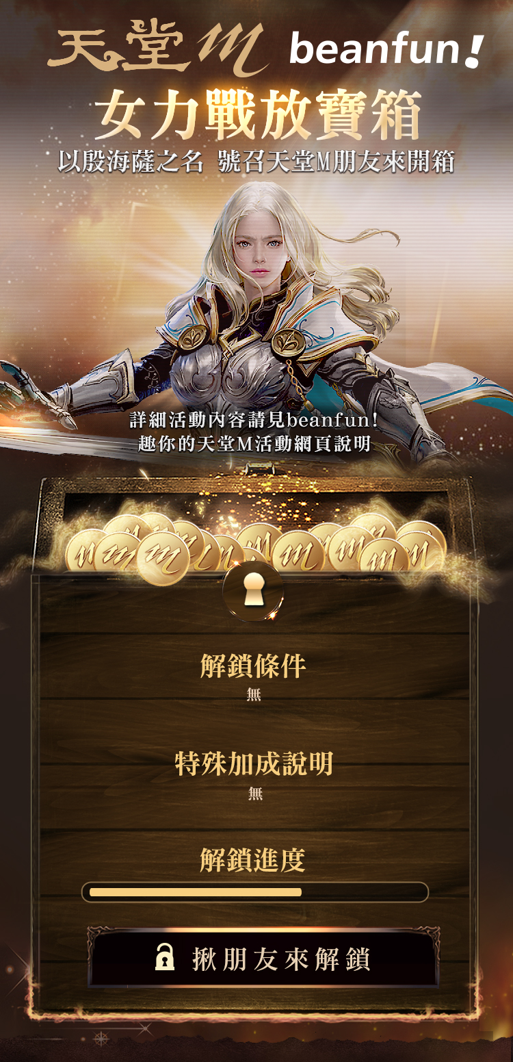 寶箱;如為《天堂M》新職業「神聖劍士」玩家,於活動期間達50級,可再獲得「女力戰