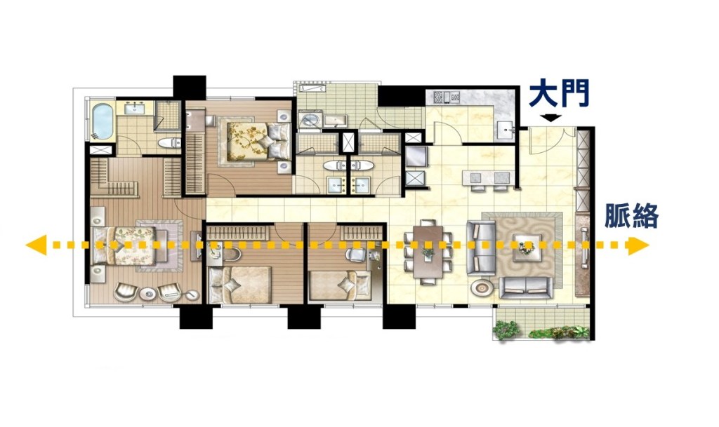當然房屋也有隱藏性的煞氣,一進門左右兩邊的角落有暗劫,若是站在房子往內看,虎邊出問題代表遇人不淑、龍邊代表做事難成,這叫做「隱藏性的劫數」。房屋要有脈絡,有氣的房屋才會強旺,若在脈絡上設有爐灶,尤其是炒菜的地方不要設置火爐,這樣會造成屋內的人容易吵架。
