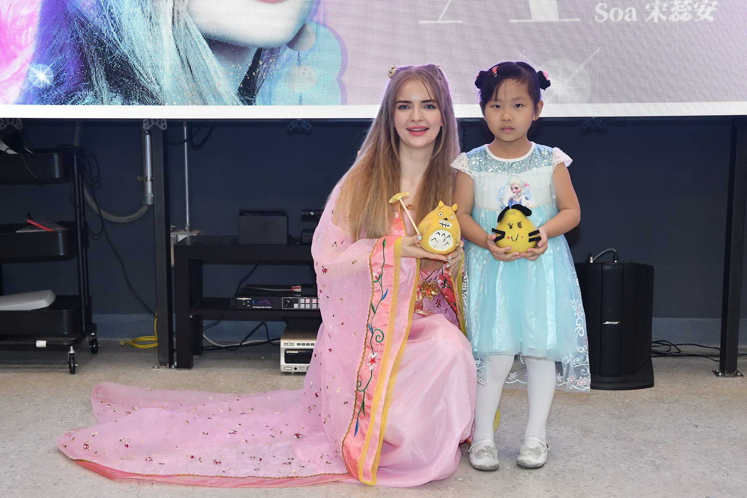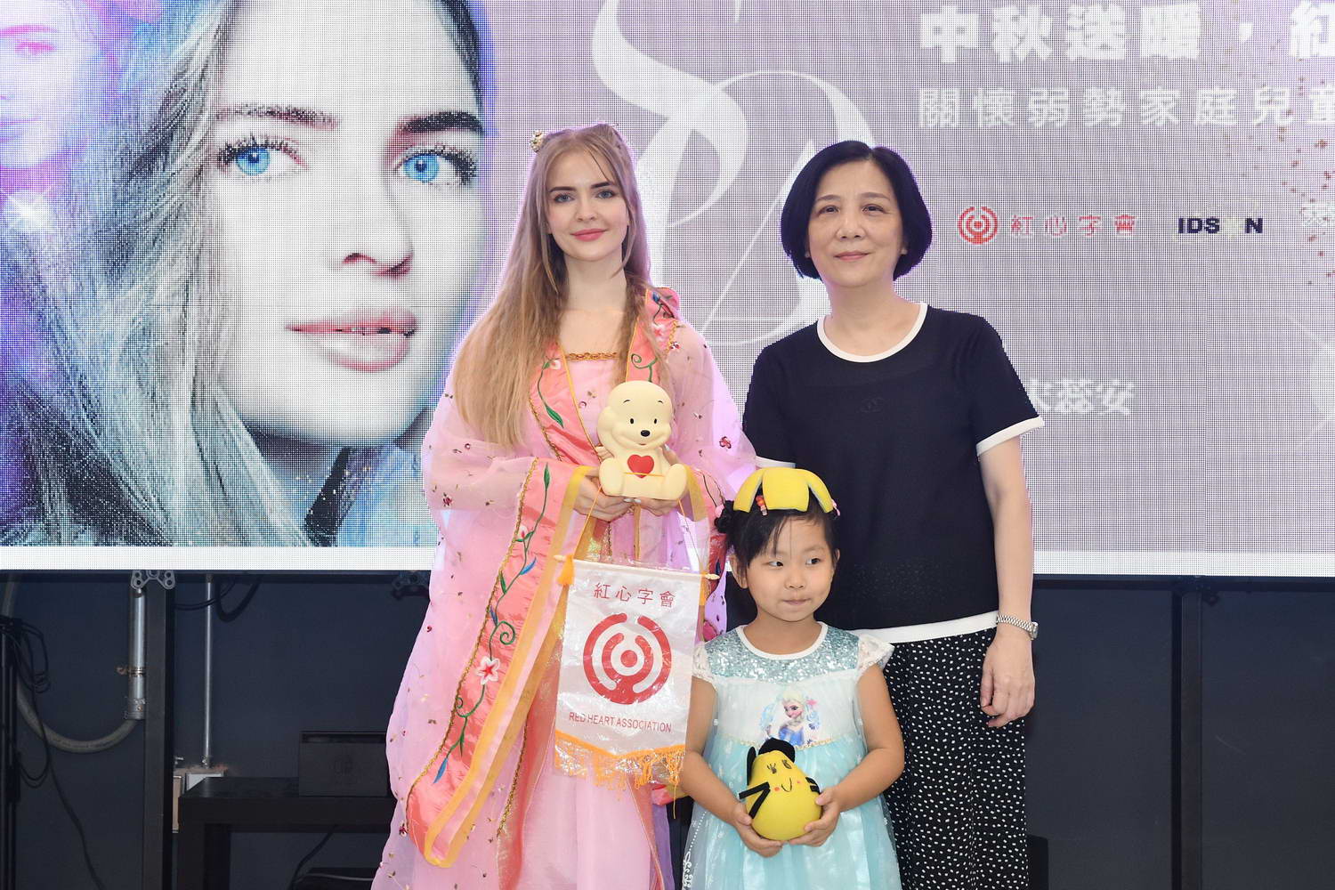 展演廳,以一席古裝扮相,化身嫦娥仙子,提前與紅心字會弱勢兒童一起過中