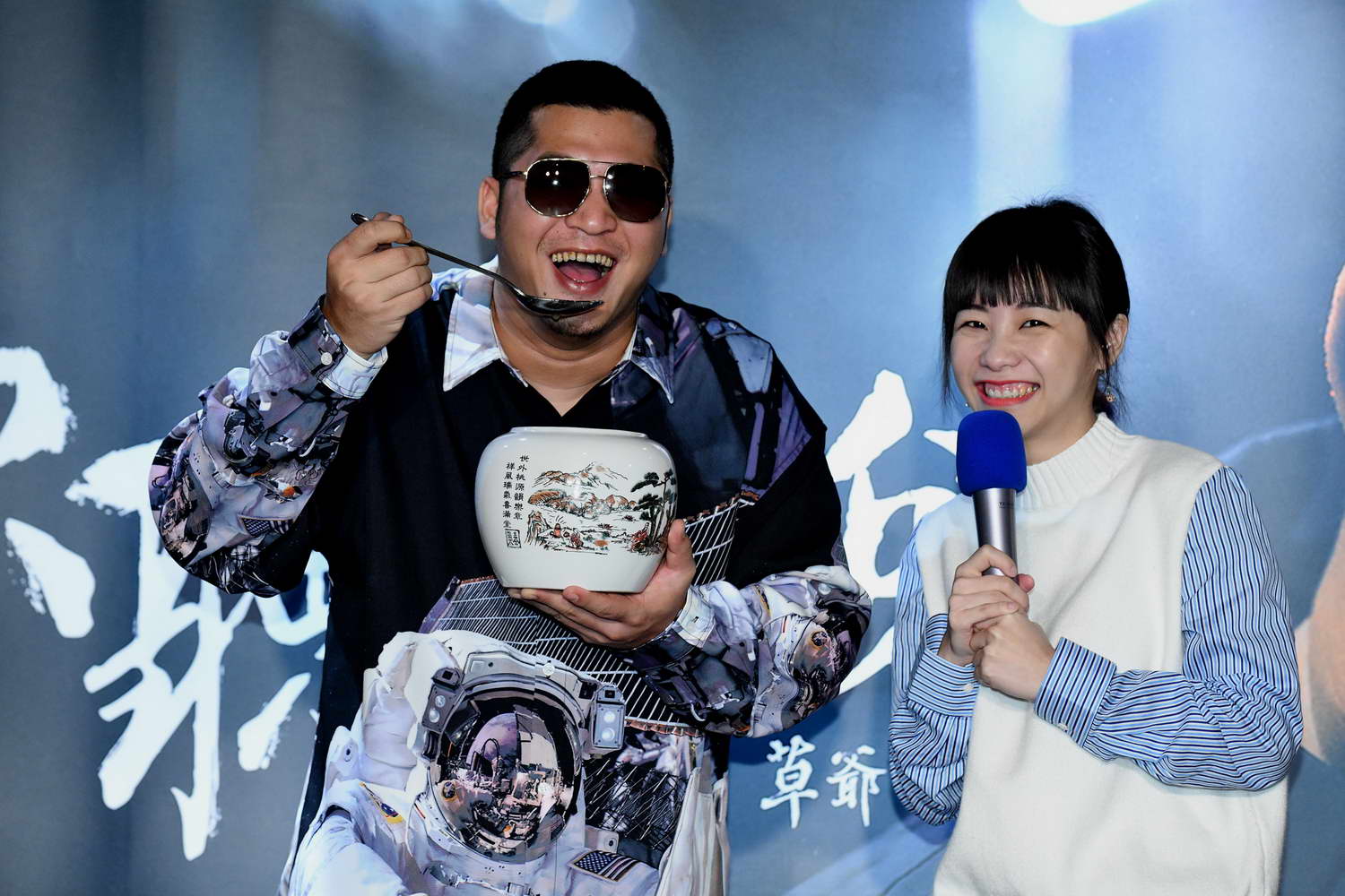 記者會上,女星王思佳帶來皮鞭,用愛鞭策草爺,期許他在演藝圈中能夠時時刻刻都要預先做好準備,每一天都要持續努力,往前邁進。YouTuber好友「眾量級」的Andy及家寧兩人帶來紅色內褲及草爺一比一的人型立牌,家寧說:草爺