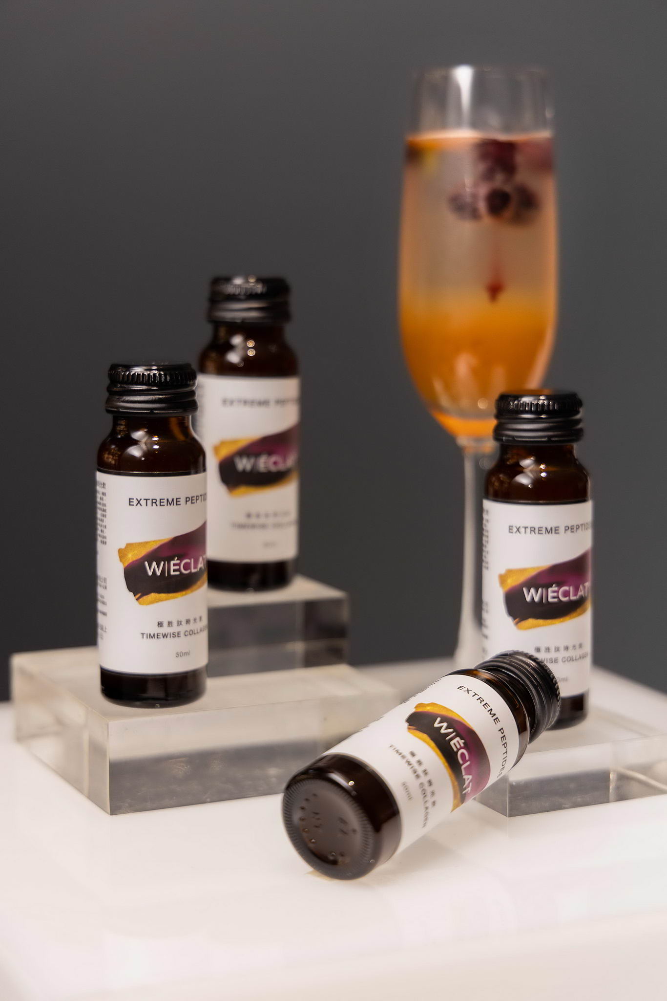 2020年W l ÉCLAT與全球膠原蛋白權威大廠-大江生醫共同研發,突破膠原蛋白不易吸收、快速流失,容易被胃酸破壞的問題。一般市售膠原蛋白成分取得大多來自牛、豬或魚鱗,「W l ÉCLAT極胜肽時光飲」嚴選5大成分和專利科技,双蛋白配方,除了選自加拿大深海鱈魚魚皮淬煉擷取的膠原蛋白肽,還添加了原物料稀有昂貴的鰹魚彈性蛋白肽,運用專利科技Double Nutri機能微粒技術把所有成份均質化為紅血球1/9大小的微粒,經臺大醫院IRB人體功效數據顯示提高生物利用率,喝一瓶Double Nutri飲品等於喝相同劑量產品2.33瓶!