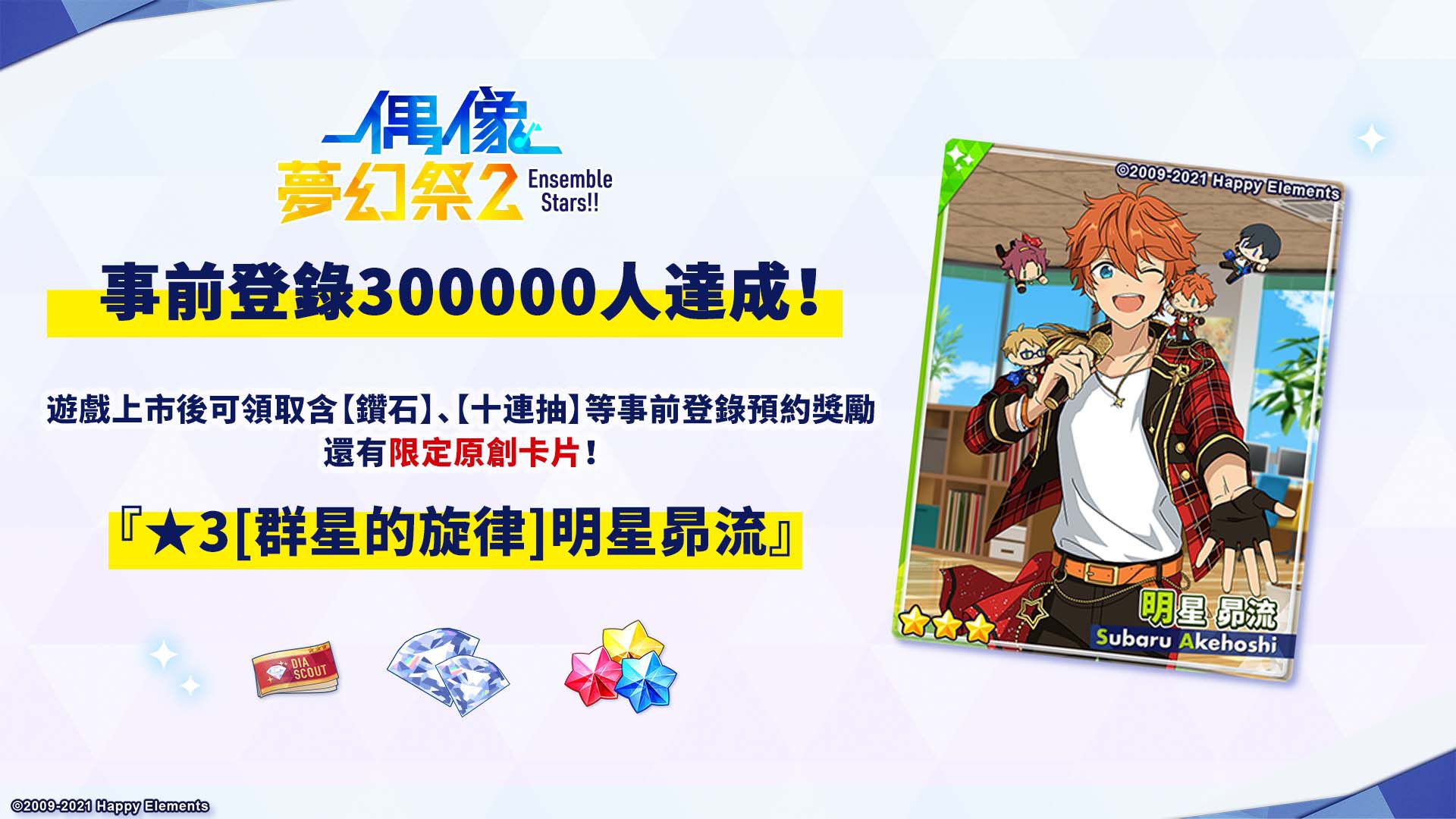 《偶像夢幻祭2》事前登錄已突破30萬+,獎勵已全部解鎖,足足可得至少21連抽的鑽石獎勵,還有三星原創卡片!