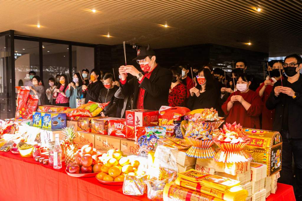事長吳鋒應景戴上牛角帽出席,率領凱渥大家庭一同祈求,能夠在金牛年帶領大家突破 疫情牛轉錢坤,共創事業新高峰,團拜的過程中香爐還一度燃起紅火旺到發爐,也意味著取得 牛年好兆頭,在結束開工儀式後董事長吳鋒一一發放紅包共享喜氣時,藝人模特們除了相互恭 祝賀詞,也紛紛展現自己最逗趣牛頭姿勢,而現場另一頭則準備蛋糕給予董事長吳鋒生日驚喜,