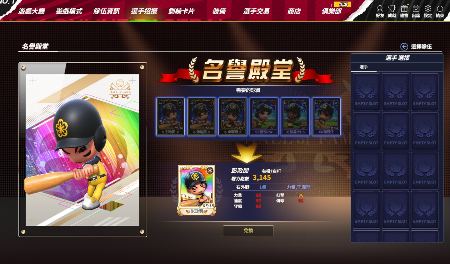 想要籌組最佳的黃金陣容嗎?那就不要錯過《全民打棒球REMASTERED》本次改版內容「譽殿堂」系統。玩家可以透過選擇希望CPBL或MLB的隊伍球員後,選擇該隊伍所屬的白金卡球員,提供相對應條件的球員卡當材料,進行兌換球員獲取更高級的白金球員卡!