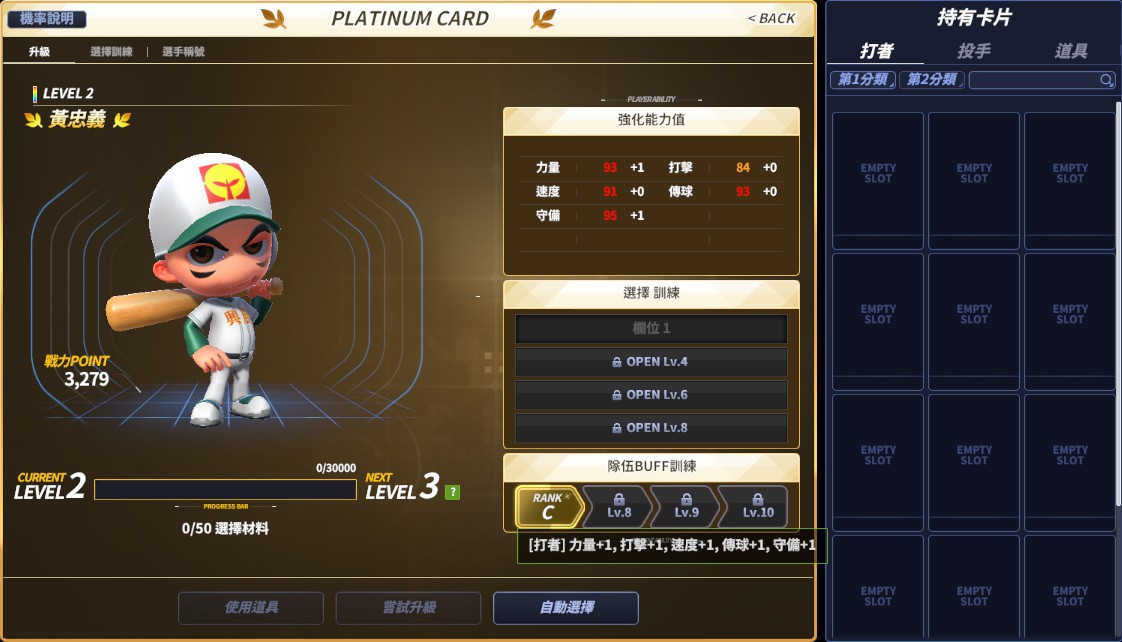 有了最佳的陣容後,想要將球員的能力值再次提升,甚至比黑卡更強大,那麼就是要將白金卡等級再次往上!《全民打棒球 REMASTERED》透過名譽的殿堂中獲得的白金卡不但能使卡片升級,提供強大的隊伍BUFF!而白金卡可以透過等級提升,不僅能讓屬性成長外,更可以有專屬的隊伍BUFF訓練,增加全隊的能力,讓你調兵遣將更得心應手,帶領球隊