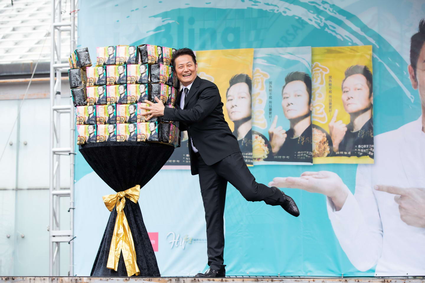 徐乃麟今舉辦「輸不起拌麵」記者會,開心抱著拌麵塔。艾迪昇傳播提供