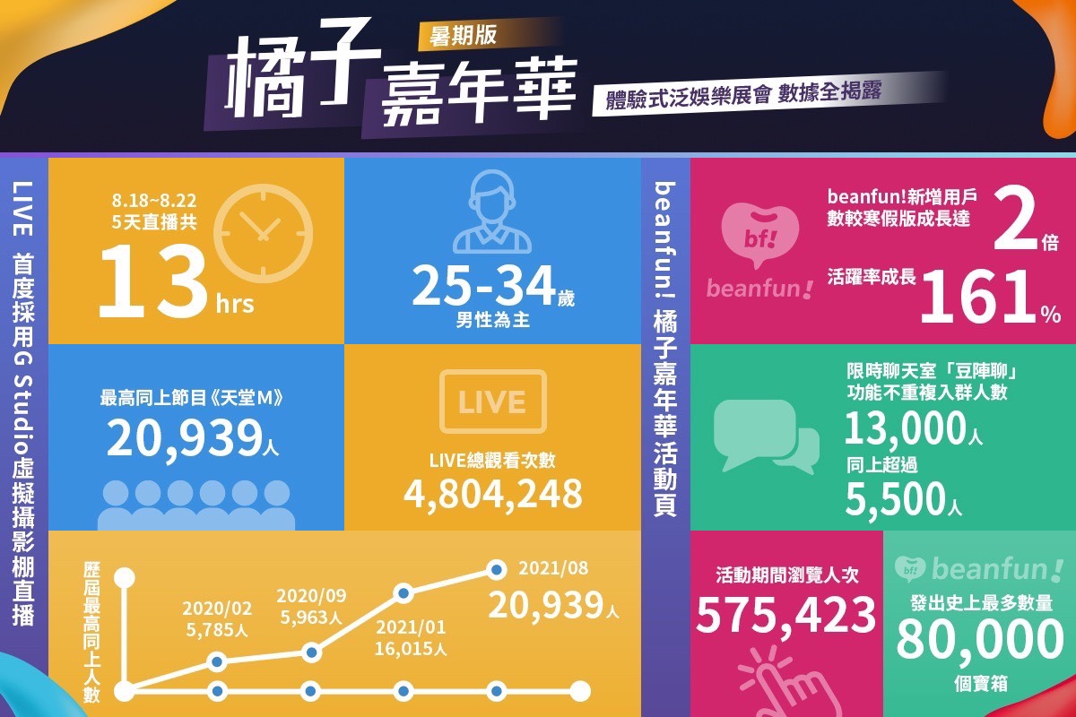 【橘子集團新聞稿】8月下旬甫落幕「橘子嘉年華暑期版」今傳捷報,活動期間湧入480萬觀看次數,而在週六晚間更打破以往紀錄,飆破2萬同上,儼然成為2021暑假最大型的活動盛會!今日也同步釋出活動精華,讓觀眾可以重溫精彩時刻。此次首度挑戰橫跨ACG、音樂、小說等領域,透過虛擬攝影棚「G Studio」,連續五天生放送,表現十分亮眼,因此也提早宣佈,橘子嘉年華將在明年寒假期間再度登場,屆時將邀請更多伙伴㩗手擴大規模,期能