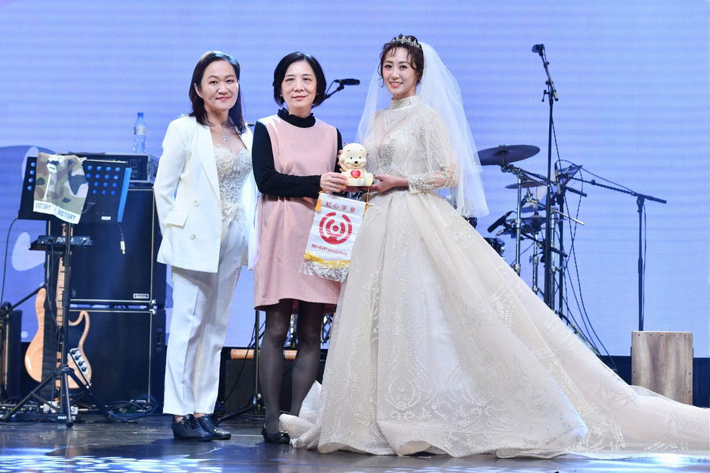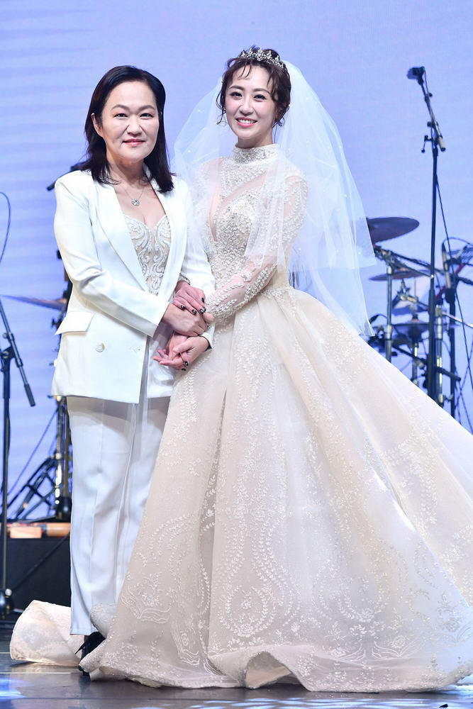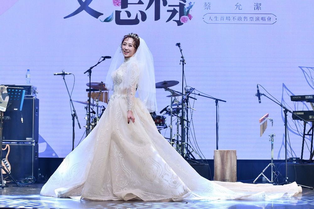一連挑戰十五首歌曲,藝人佩佩提供價值百萬的韓式婚紗,讓蔡允潔華麗登場