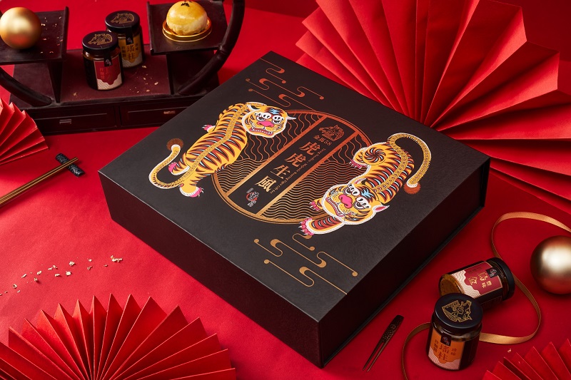 ▲禮盒封面以年節氣息濃厚的雙虎圖騰刻畫,加上盒面燙金和虎皮壓紋等細節,整體精緻高調極具氣派。