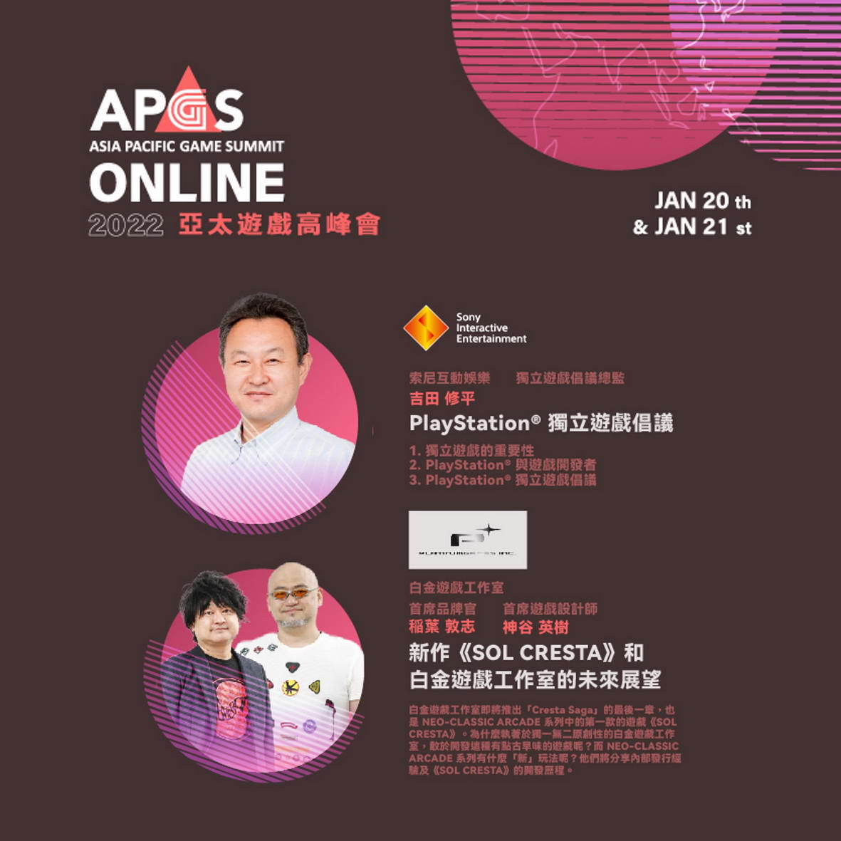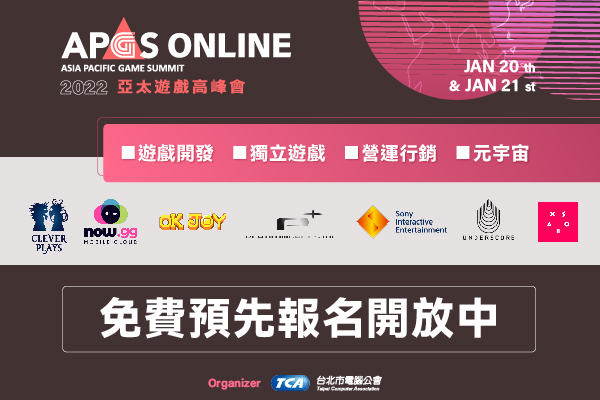由台北市電腦公會主辦的2022亞太遊戲高峰會(Asia Pacific Game Summit,下稱APGS),將於1月20至21日於線上登場,今年講師分別邀請來自索尼互動娛樂、日本的白金遊戲工作室、香港OK JOY、服務遍及全球的艾克索拉、總部位於美國矽谷的now.gg、台灣踩底線遊戲、加拿大Clever Plays Studio、Red Nexus Games的業界專家,陣容相當堅強,講師中尤以索尼互動娛樂的獨立遊戲倡議總監吉田修平、白金遊戲工作室的首席品牌官稻葉敦志與首席遊戲設計師神谷英樹最為受到關注,目前免費預先報名已經開放,連續兩日的精彩講座,遊戲業界人士與專業玩家千萬不能錯過。