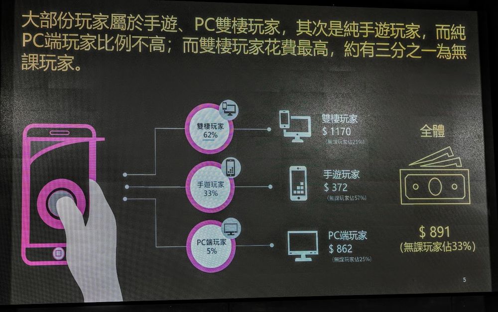 根據台北市電腦公會委託尼爾森行銷研究顧問進行調查的「2021臺灣玩家行為調查關鍵報告」指出,全台玩家中有高達62%的比例是同時使用PC端及手機玩遊戲的雙棲玩家,其次為純粹喜好手機遊戲則有33%,僅使用PC遊玩的玩家僅有5%。