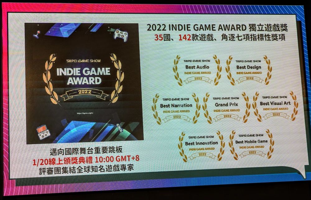 而眾所矚目的「Indie Game Award 2022」今年吸引35國142款遊戲參與爭奪7大獎項,最終僅有27款遊戲闖進最終決選,由各國專業遊戲媒體人評選出的最終獎項得主,將於1月20日上午10時於TGS官方YouTube頻道「Taipei Game Show」揭曉。