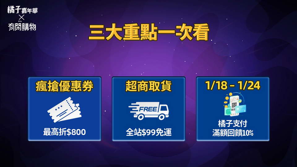 「有閑購物」則推出專屬大禮包,全站滿99元免運費,領券再買最高折800元,即日起至1月
