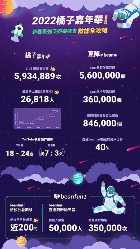 「2022橘子嘉年華春節版」圓滿落幕,線上直播節目匯聚遊戲、音樂、料理三大泛娛樂主題,締造近600萬總觀看次數,刷新歷屆最佳成績;在《天堂M》領軍之下,最高同時在線人數於直播第三天(1/22)衝破2.6萬,續創新高。本次首度推出的新型態互動玩法「豆陣來bean果」,beanfun!用戶瘋搶總價值超過4.3億的虛寶及總價破千萬的實體獎品,長達22天的活動期間(1/17至2/7)總計發放36萬張bean果卡、560萬顆bean果豆、84.6萬個連線獎勵寶箱,帶動beanfun!新增用戶數較2021暑期版成長近200%。