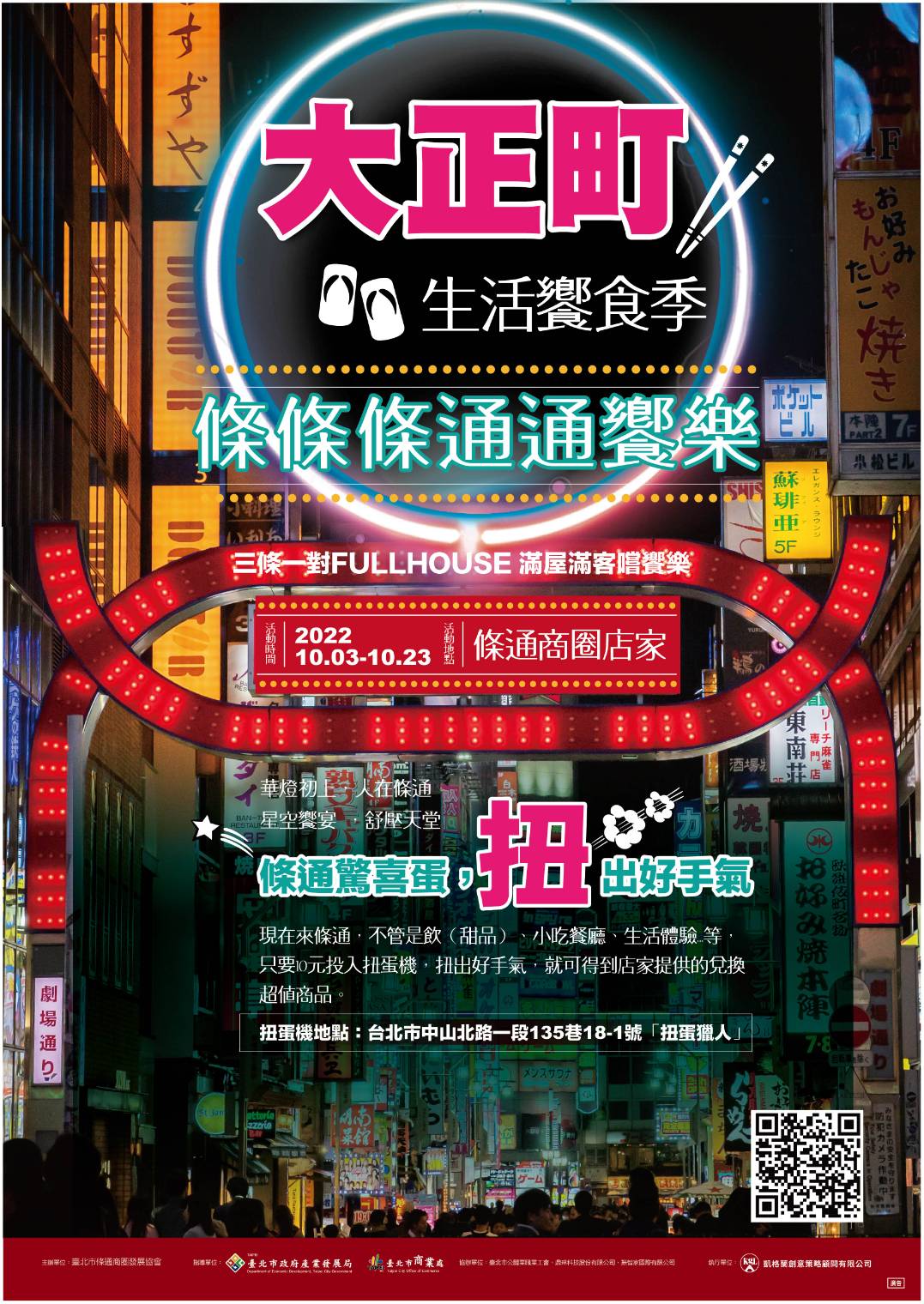 為促進商圈商機活絡,由臺北市商業處輔導臺北市條通商圈發展協會自主辦理「大正町生活饗食季」條條條通通饗樂,集結19家特色店家,包含飲料店、餐飲店等多樣美食,為廣大消費者推出驚喜優惠,於即日起至111年10月23日特別推出限量「條通驚喜蛋」,邀請大家一起來玩扭蛋。