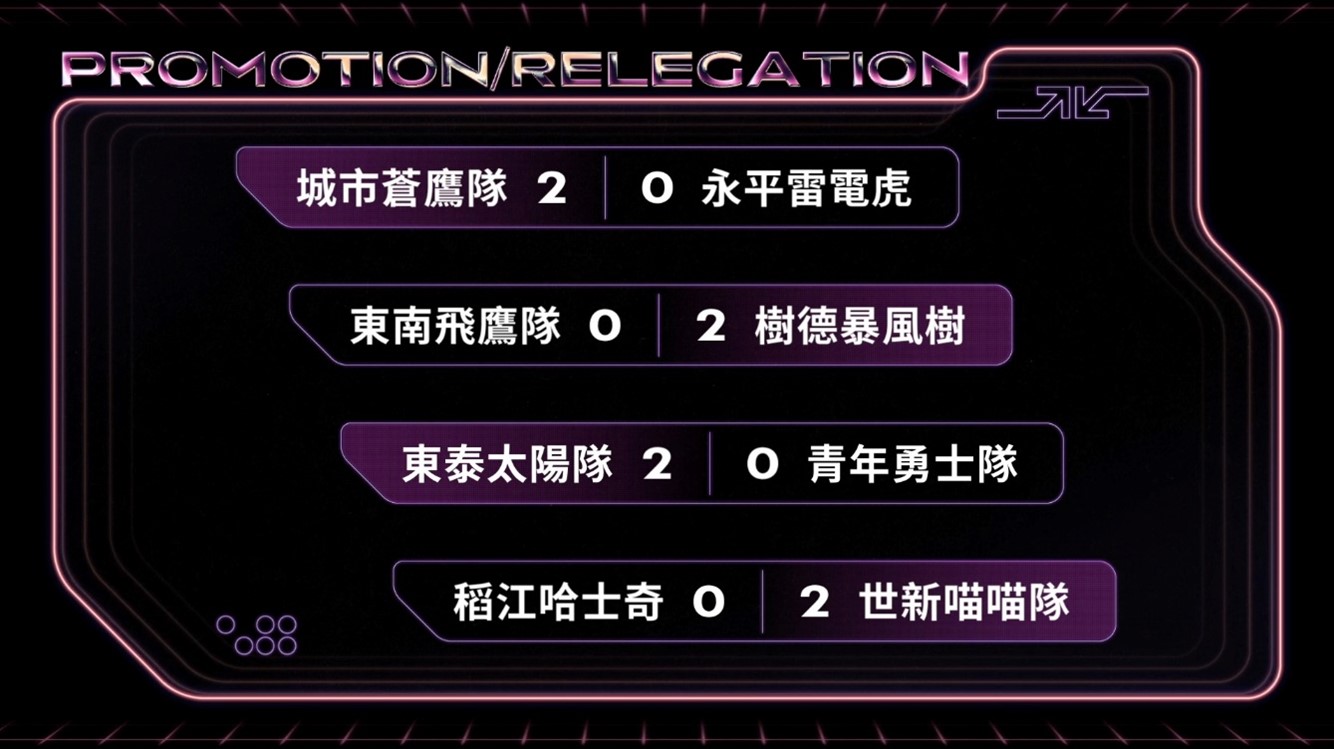 本季升降賽東泰太陽和城市蒼鷹皆穩操勝算,輕鬆直落二擊潰對手,成功保級;但稻江哈士奇和東
