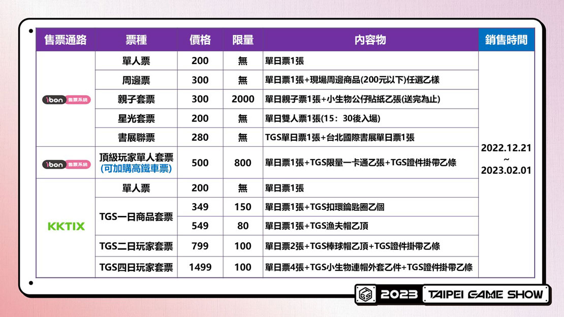 TGS預購票現正熱賣中,玩家即日起可至ibon、KKTIX預購,原價250元、早鳥價只要200元,今年也首度推出星光套票,預購者可享每日15:30後雙人同行、一人票價的優惠,TGS更與台北國際書展合作推出雙展套票,只要280元就可兩場大展一次逛到飽,還有親子套票、可加購八五折台灣高鐵車票的頂級玩家套票方案等多元方案。