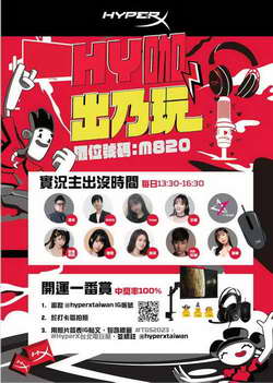 HyperX 舞台區連續電玩展四天舉辦實況主 PK 賽,邀請專業主持人兼賽評湯米、 RB 世誠、赤鬼伯伯、湘湘、妲妲、子喵、凱琪、 Yuna 、 9QOQ 等九位高人氣實況主以及《英雄聯盟》職業戰隊 J Team 二隊與玩家們一同 PK 對戰,知名大作《英雄聯盟》、《 APEX Legend 》以及家機類遊戲《 Just Dance 》等熱門遊戲。