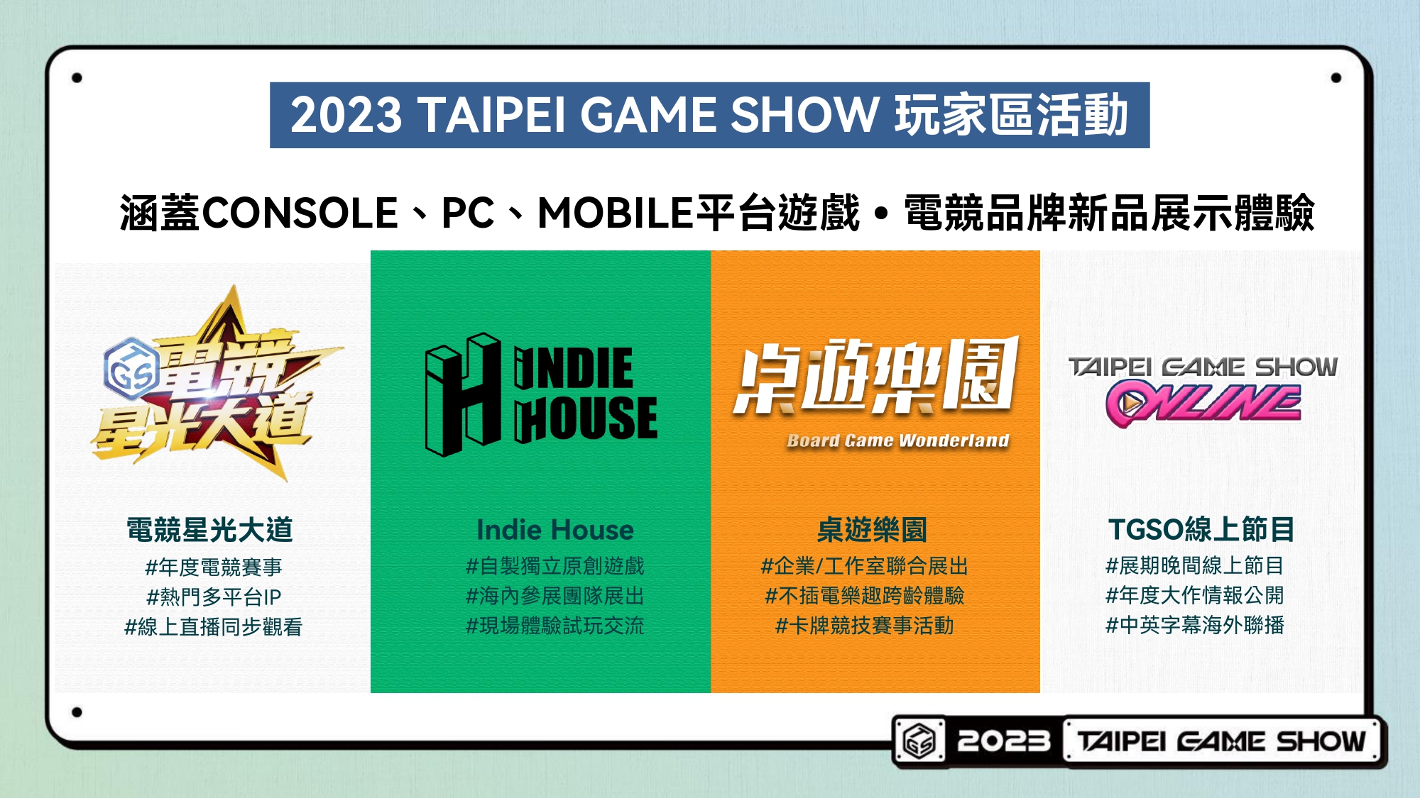 除了一般展區,專門為玩家規劃的電競星光大道、Indie House 獨立遊戲專區、桌遊樂園,Taipei Game Show Online 線上節目,也會一併回歸。