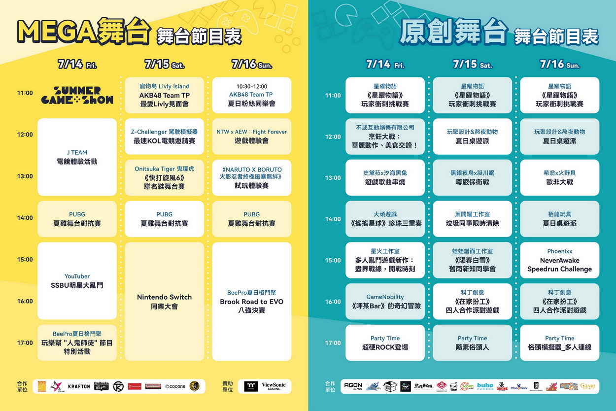 而兩大舞台則將連續三天帶來精彩活動,其中「MEGA舞台」將有「SGS 夏雞舞台對抗賽」,由人氣實況主Xargon、KO、赤鬼伯伯與粉絲同樂大玩《絕地求生》,潮流品牌Onitsuka Tiger鬼塚虎與知名格鬥電玩《快打旋風6》的聯名鞋舞台賽,則邀請電競選手石油王及小熊到場進行特別活動,而《寵物島Livly Island》也請到人氣女團「AKB48 Team TP」出席「最愛Livly玩家見面會」並現場演唱知名歌曲,AKB48 Team TP次日也將舉辦夏日粉絲同樂會,此外還有J TEAM邀請電競戰隊與知名實況主赤鬼伯伯、妲妲一同現身與玩家互動並帶來電競體驗活動,而「YouTuber SSBU明星大亂鬥」中,原阿布雷成員堯哥、琛琛、余渣將再次同台,並與鵝肉麵、井川一等人捉對廝殺一較高下,「最速KOL電競邀請賽」則由專業主播湯米與知名賽車手WandereR小湯一同擔任主持人,並請來阿神、黑羽等擔任選手,在虛擬山道中競速狂飆,還有喜愛格鬥賽事觀眾千萬不能錯過的「BeePro夏日格鬥聚Brook Road to EVO 八強決賽」,現場還有「《NARUTO X BORUTO 火影忍者終極風暴羈絆》試玩體驗賽」、「NTWxAEW:Fight Forever遊戲體驗會」及「Nintendo Switch同樂大會」,邀玩家一起上台盡情同樂。