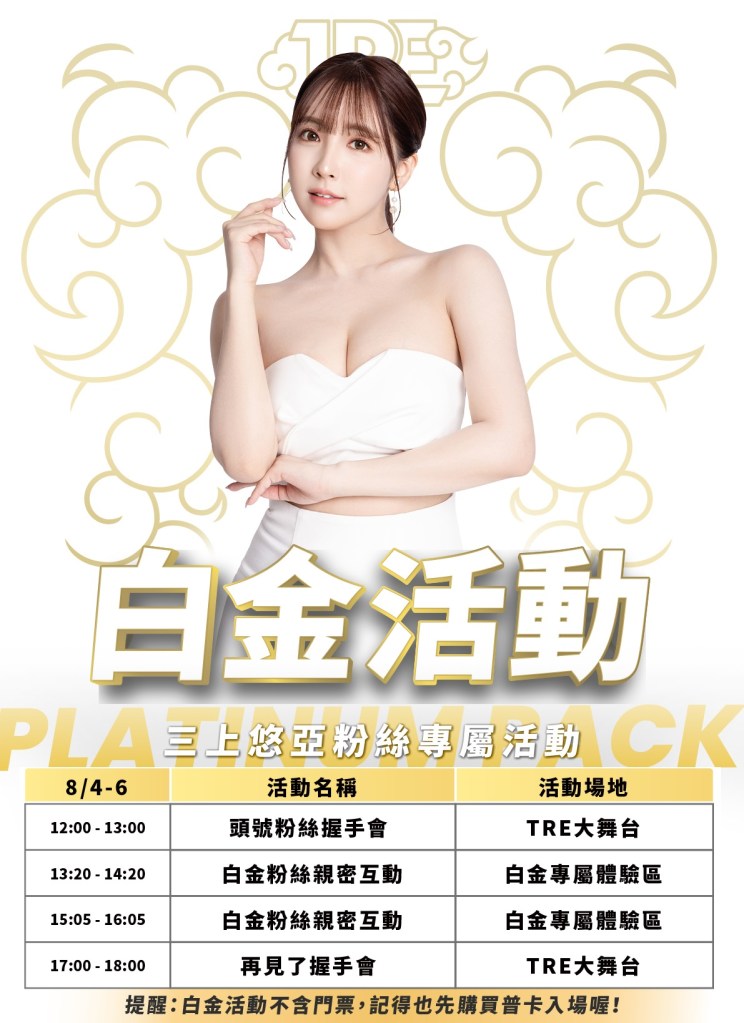 為了進一步與女神零距離獨處的機會,主辦單位精心規劃「金卡—女優親密接觸」、「白金卡—女優親密互動」讓粉絲朋友可以和心儀的女神一對一互動,除了合照、簽名,還能與女神近距離交流,現場配有專業翻譯,讓你溝通無障礙,歡迎大家攜朋引伴,一起體驗與眾不同的年度盛事。