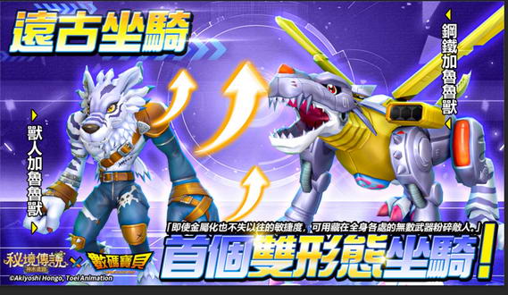 與戰鬥暴龍獸同期登場的還有雙形態聯動限定坐騎「鋼鐵加魯魯獸」,將在「龍神寶庫」中登場!鋼鐵加魯魯獸幾乎全身都金屬化,即使金屬化也不失以往的敏捷度,可用藏在全身各處的無數武器粉碎敵人。玩家可自由切換成能以雙腳行走的獸人型數碼寶貝「獸人加魯魯獸」形態。