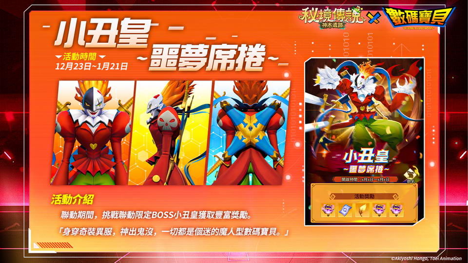 身穿奇裝異服、神出鬼沒,一切都還是個謎的魔人型數碼寶貝「小丑皇」將作為聯動BOSS降臨秘境,這次他將為冒險家們帶來什麽樣的挑戰呢?在聯動活動「小丑皇~噩夢席捲~」中,玩家通過挑戰強敵BOSS「小丑皇」即可解鎖豐厚獎勵。
