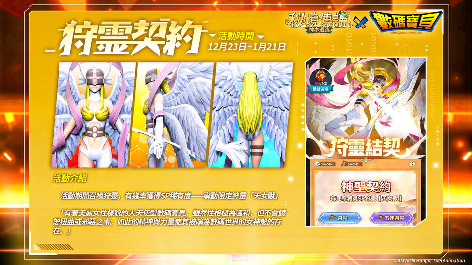擁有六片燦爛奪目的翅膀,身穿神聖白衣的天使獸將作為聯動限定幻獸在活動「時空販賣機」中限時登場!天使獸是絕對善良的存在,但對邪惡非常冷酷,在徹底消滅對手之前不會停止攻擊。