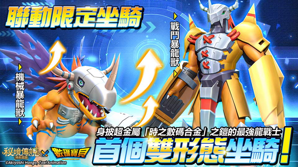 首個雙形態聯動限定坐騎「戰鬥暴龍獸」將在「星島嘉年華」中登場!身上穿著超金屬「數碼合金」鎧甲的最強龍戰士,和暴龍獸系數碼寶貝一貫的巨大身軀不同,有著人型外表。玩家還可自由切換成身體一半以上都已機械化的「機械暴龍獸」形態。