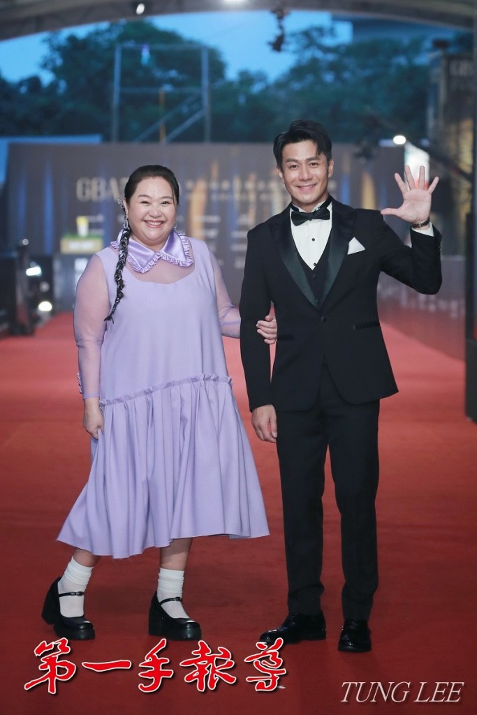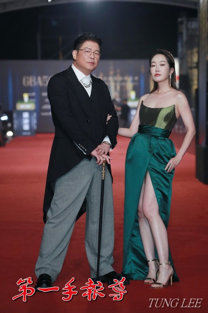 ▲曾國城(左)拄著拐杖和巴鈺(右)一同現身紅毯。
