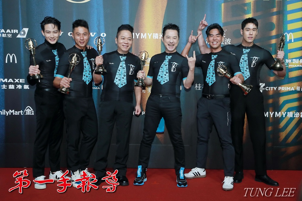 ▲庾澄慶領軍的節目「騎吧!哈林小隊」拿下節目類益智及實境節目主持人獎,與主持群張庭瑚(左起)、彭小刀、卜學亮、周予天(右起)、柯有倫在後台開心合影。