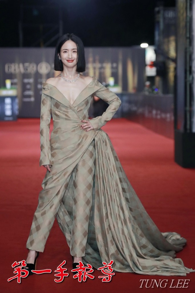 ▲林依晨身穿褐色帥氣禮服,胸前大開V字領。