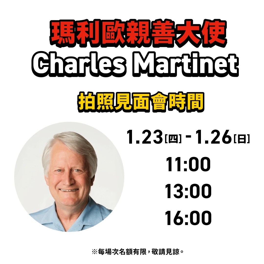 今年,邀請到 瑪利歐親善大使查爾斯・馬爾蒂內(Charles Martinet) 來台,與玩家一同合影留念。玩家可於每日 11:00、13:00、16:00參加見面會,還有機會能獲得見面會限量特典「無敵星紓壓球」。
