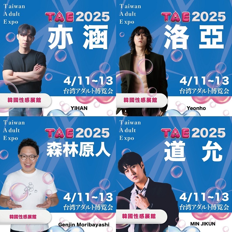 TAE「台灣成人博覽會」即將於4月11至13日在台北世貿一館C區盛大登場。今年的展覽規模大升級,不僅邀請日本頂流暗黑女神、韓國性感女神,魅力爆棚的帥氣男星、國際級寫真女星、大尺度COSER與台灣高人氣女神,近百位巨星齊聚一堂。這次不僅是男性朋友的追星天堂,女性粉絲更能盡情沉浸在帥氣男優的魅力之中,現場更是完整福利大放送,只要想拍都能夠填滿你的記憶卡!