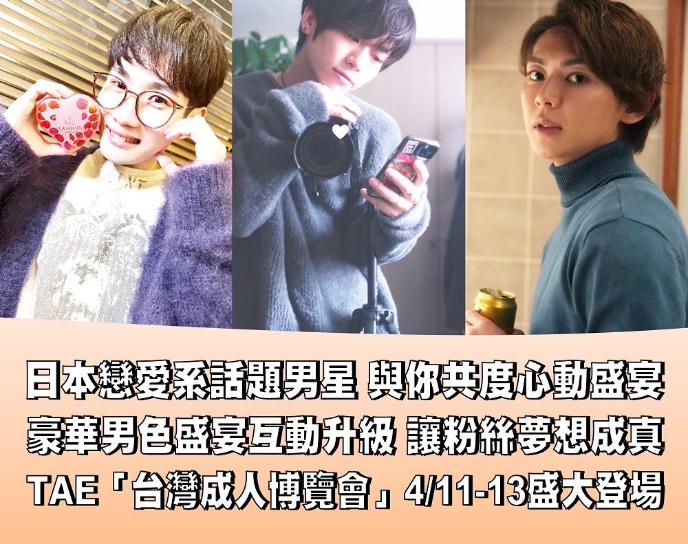 年度最受矚目的戀愛系AV男優陣容,在TAE「台灣成人博覽會」4/11-16震撼登場!今年由Kenny攤位獨家策劃、精心籌備,特別邀請日本三位話題男優強勢登台包括擁有「控射傳奇」之稱的耐久系男優北野翔、以「超完美雞雞」爆紅的戲劇系男神上原千明,以及首次來台、憑藉鄰家溫柔形象深得女性觀眾喜愛的千歲小梅,到場與粉絲近距離相見,勢必讓現場粉紅泡泡滿溢。