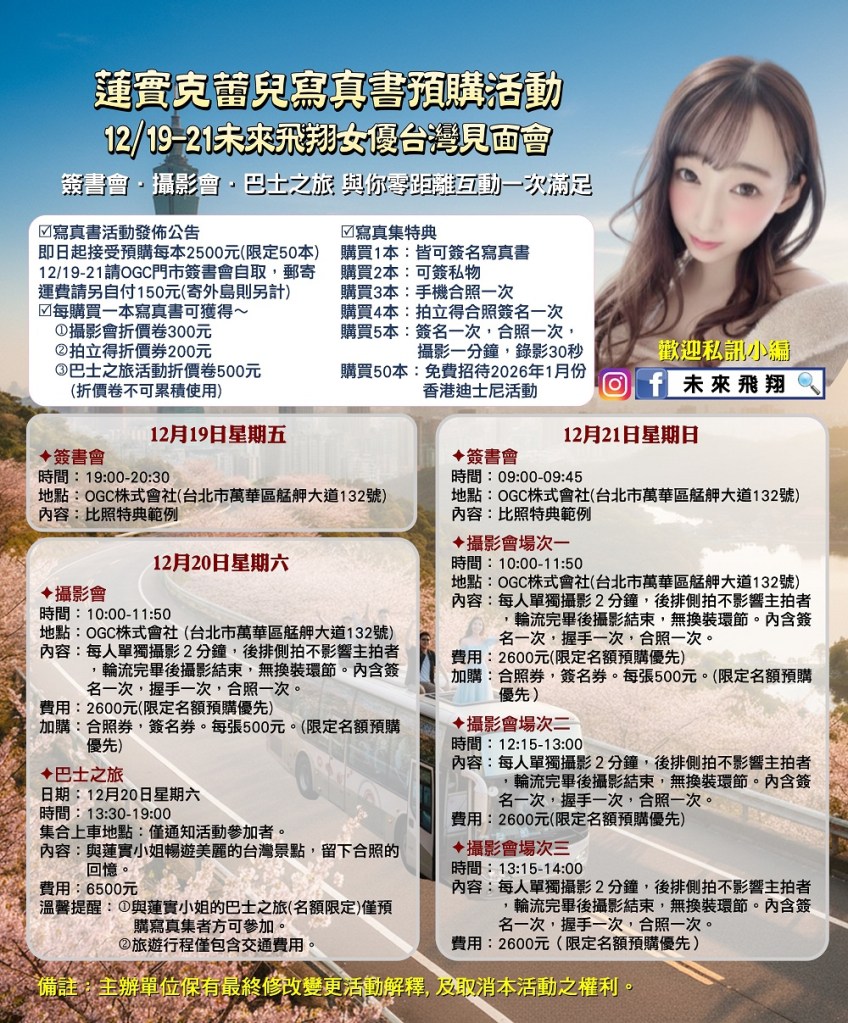 她宣布將在12月19日至12月21日出席日本龍頭成人動漫公司《未來飛翔》女優見面攝影會活動,在《OGC株式會社》與粉絲朋友們零距離相見 !