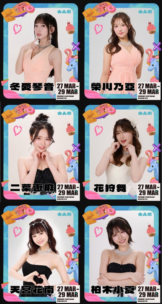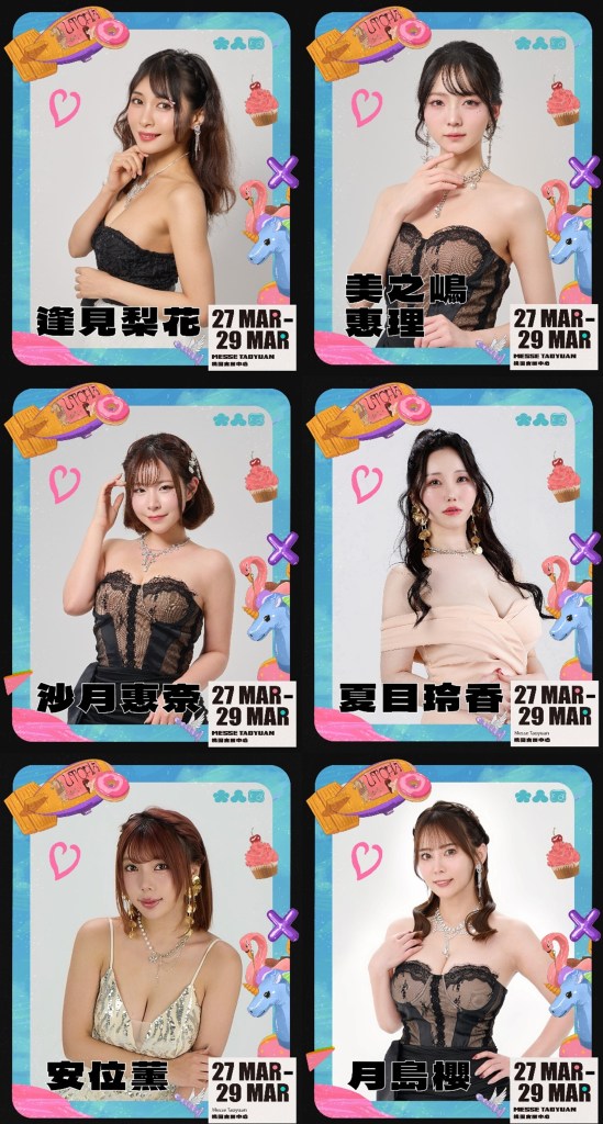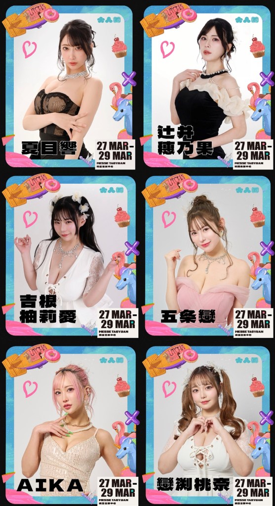 此外,擁有「黑珍珠」美譽、形象轉變為白皙美人的 AIKA 也將難得來台,與「挑逗女王」大槻響,在台灣人氣爆紅,有著超高人氣的「補教正妹」紫堂留衣,被粉絲暱稱為「暗黑版迪麗熱巴」的白峰美羽,以及美之嶋惠理、「M CUP」吉根柚莉愛、沙月惠奈、辻井穗乃果、栗山莉緒,都將與粉絲近距離互動。