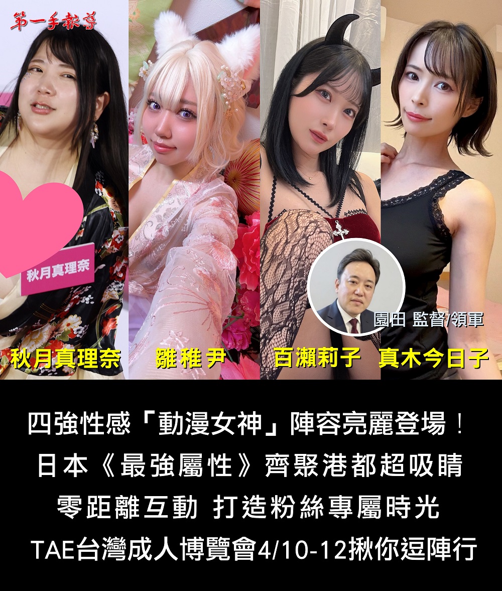 最令粉絲關注的,日本知名成人動漫片商《最強屬性》由園田監督領軍,這次邀請雛稚尹、真木今日子、百瀨莉子、秋月真理奈來台出席活動,參展民眾粉絲可以零距離與偶像互動,現場氣氛勢必爆棚!
