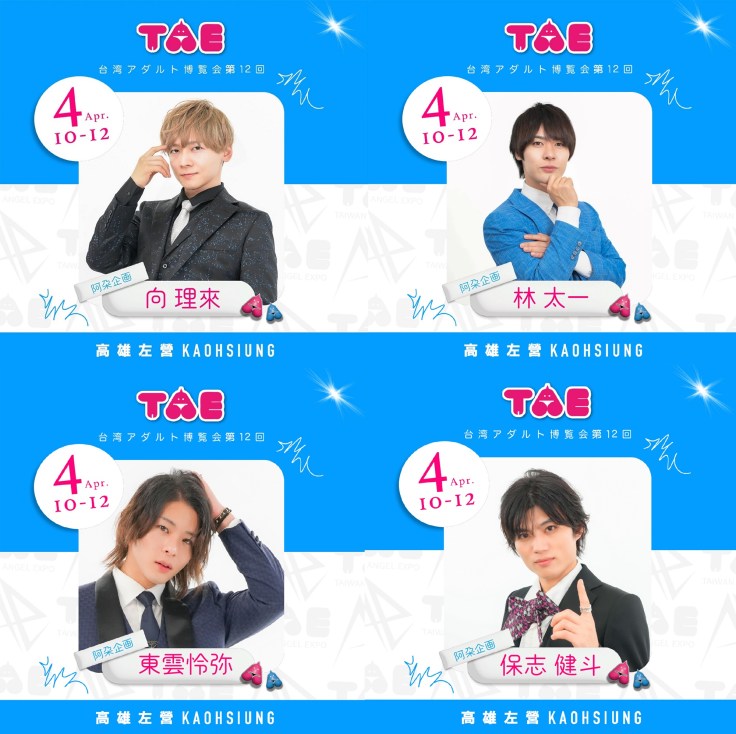 女性向 AV 經紀領導品牌「阿朶企画」公布第一波男星名單,最引起女性朋友關注有第一男神封號的「砂糖系男優」向理來、「天菜小鮮肉」林太一、「模特冷都男」東雲怜彌、「鄰家大男孩」保志健斗,即將在 TAE 「台灣成人博覽會」現身出席《阿朶企画》企業攤位活動。