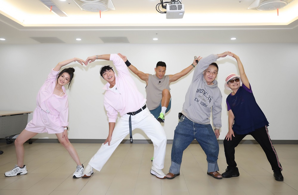 記者會上,PIKE SIX 健身中心的Danny 老師,也帶領蜜雪、江耀崙及長輩們一起大跳健康操。蜜雪說,這幾天比較有在吃,所以得要固定運動,才能把自己塞進超緊身的運動衣裡。