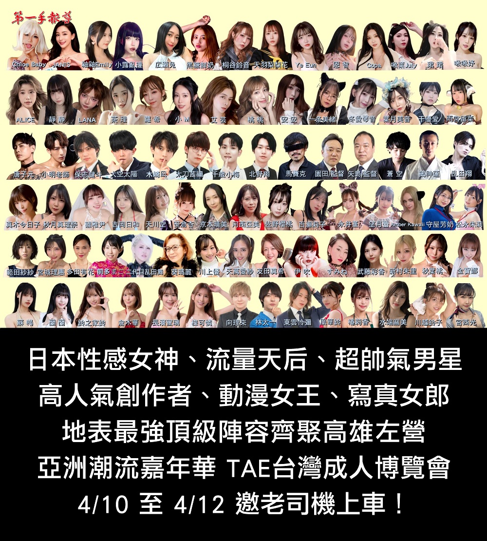 ▲ TAE「台灣成人博覽會」邀請日本性感當紅女優、帥氣男星、高人氣寫真女神、創作者等出席 4 月 10 日至 4 月 12 日「左營高鐵共構 10 樓國際活動展演中心」活動!(圖:TAE台灣成人博覽會、博展國際/以下同)