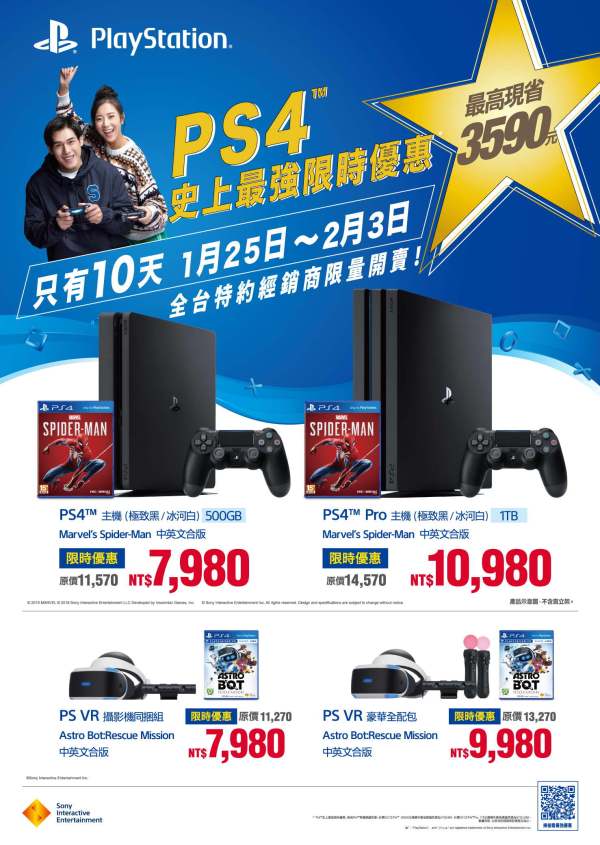 1/25~2/3 十天限定 「PS4™史上最強限時優惠方案」全台限量展開! 主機限時優惠價再加贈PS4™《Marvel’s Spider-Man》 ~至2019台北國際電玩展 購機再加送DUALSHOCK®4無線控制器~ ~PS VR優惠方案同步展開~ 2019-01-16 0