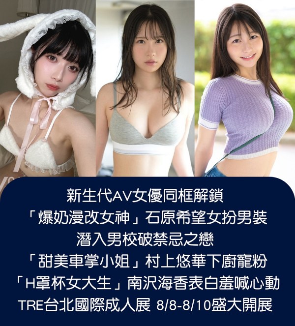 新生代AV女優同框解鎖「爆奶漫改女神」女扮男裝潛入男校禁忌戀愛破尺度、「甜美車掌小姐」下廚寵粉、「H罩杯初戀」首戰處女秀羞喊心動,「 AV One Love萬楽 」重現日劇經典戀愛情節!2025 TRE台北國際成人展 8/8-8/10 狂熱開展 邀老司機加速上車 2025-07-31 0