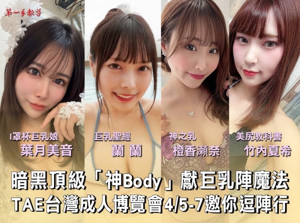 日本頂級「神Body」香橙瀬奈 、「美尻教科書」竹內夏希、「I罩杯巨乳娘」葉月美音、 「巨乳聖經 」蘭蘭 來台獻巨乳陣魔法! TAE台灣成人博覽會4/5-7 讓你一手無法掌握 2024-03-22 12