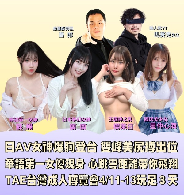 台灣最強「華語第一女優」蘇暢、日本「王道神乳」櫻茉日、「夢幻甜心」蘭蘭、「美尻教科書」星仲心海、「重量級男星」吾郎 閃亮登台與粉絲零距離接觸!TAE「台灣成人博覽會」4/11-13台北世貿一館 拍好拍滿帶你飛翔 2025-04-04 3
